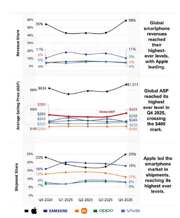 终究,就拿NE-glass来说,苹果iPhone的平均售价(ASP)正在2025年第四时度初次跨过1000美元大关(已达1011美元,